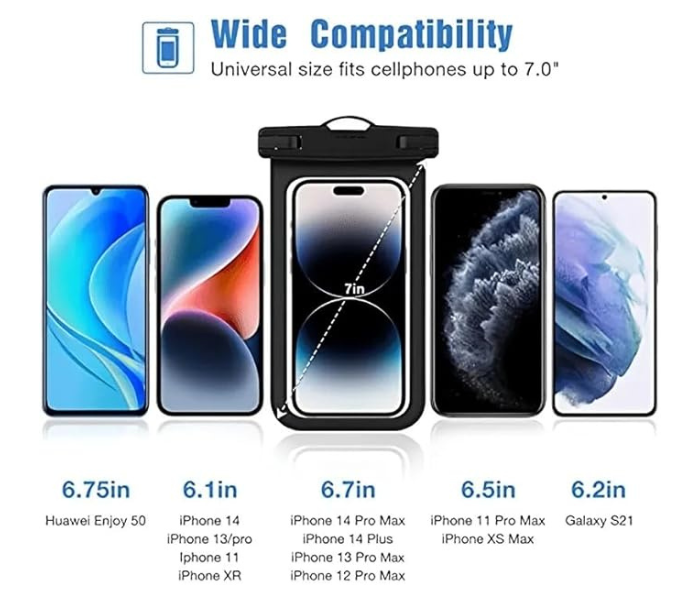 Protect your phone anywhere! This waterproof pouch keeps your device safe from water, sand, and dust while swimming at the beach, or during outdoor adventures. Clear, touch-sensitive cover lets you use your phone without removing it. Fits most smartphones.